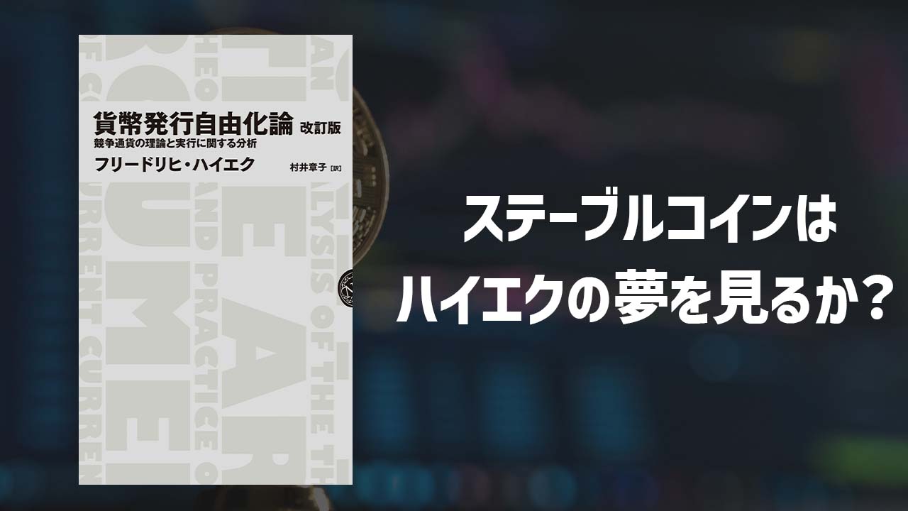 ハイエクが著し、1976年に刊行された”Denationalisation of Money”(邦題『貨幣の脱国有化論』『貨幣発行自由化論』)は、経済学の古典の1つでありながら、近年の暗号通貨の隆盛に従って再び注目を集めている。今回の記事では、ハイエクの主張を概観した後、暗号通貨、およびステーブルコインに対して、ハイエクの主張と合わせてそれぞれ検討する。